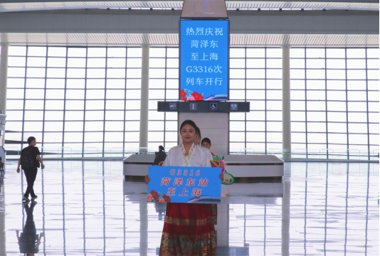 菏泽东站进站口处设置欢迎展板,在候车室检票口两侧设置首发列车海报和菏泽旅游景点海报,邀请文艺团队在候车室内表演地方特色舞蹈,并组织首发列车乘客合影留念。