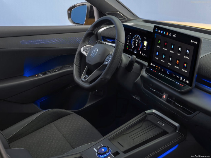全新探歌的设计ID.化,前后贯穿式的灯组、发光车标、蜂窝状格栅,都有时髦的气质。车内则像ID.3变体,除了饰条包裹的IP台有更丰富的造型外,12.9英寸悬浮屏、电子怀挡、氛围灯都是大众新能源产品的标配。